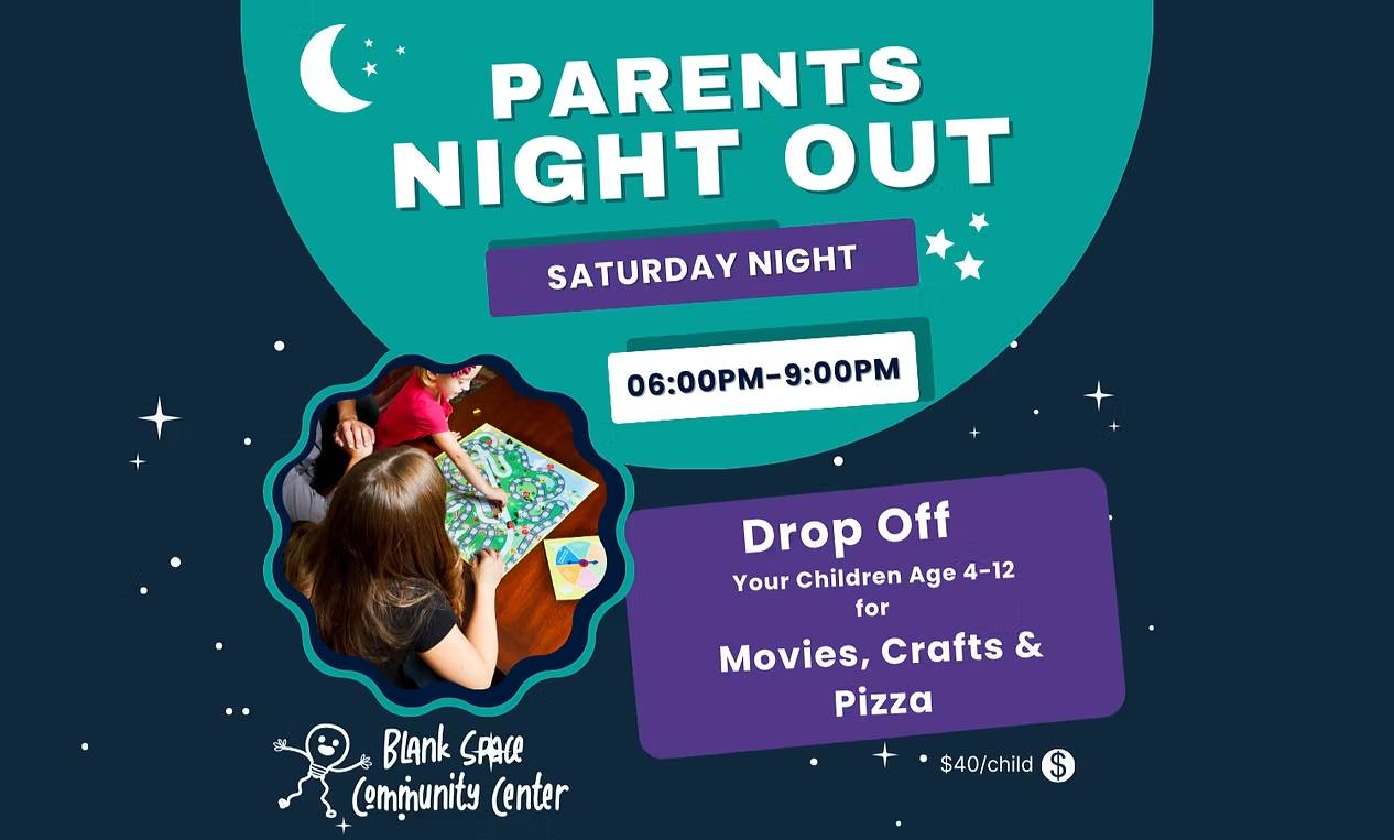 Time for a night off? Drop your kids (ages 4–12) at Blank Space Community Center from 6–9 PM for a fun-filled evening of movies, crafts, and pizza while you enjoy a little you time!