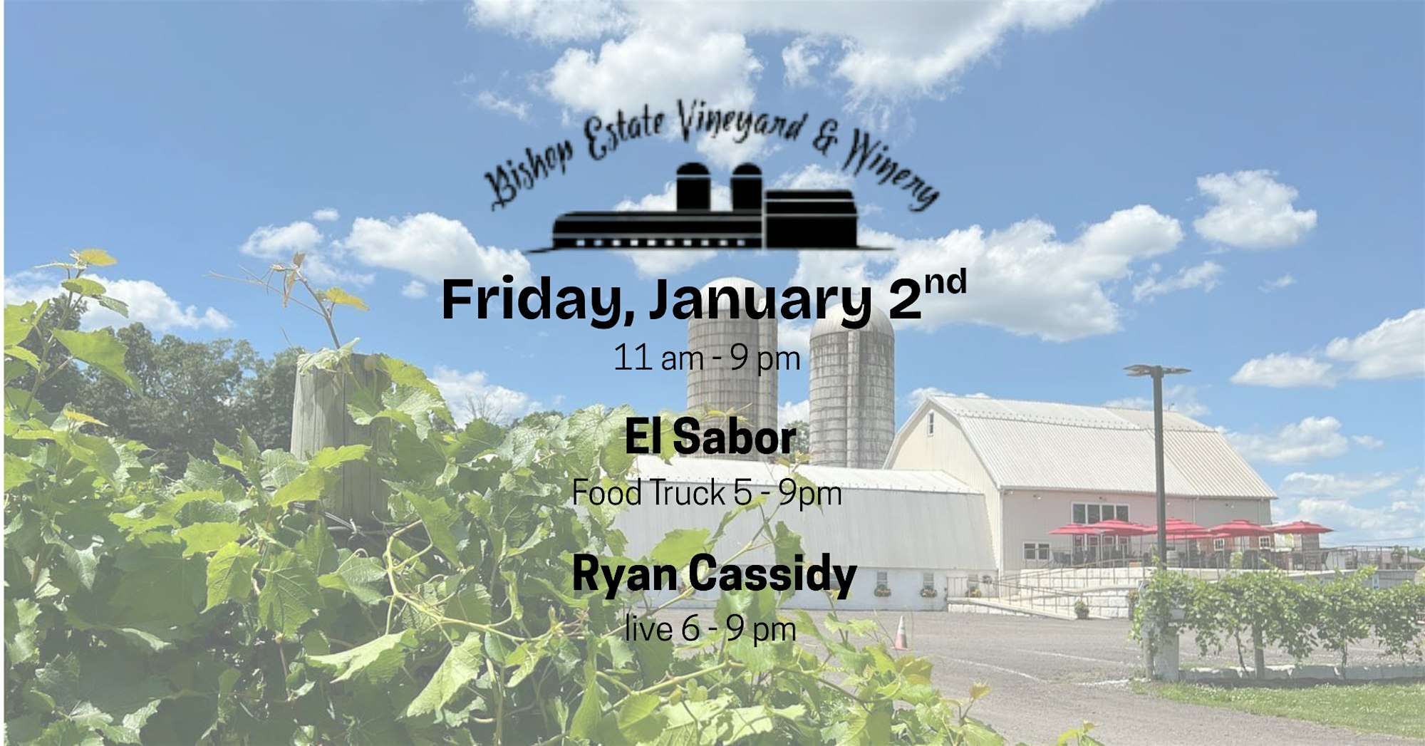 Enjoy food trucks and live music at Bishop Estate Vineyard and Winery on both Friday and Saturday. Friday night from 5-9, there will be live music by Jamie Stern and El Sabor Food Truck. On Saturday, Spuddy Buddy Food Truck will be on site, as well as Mike & Brian playing live music.